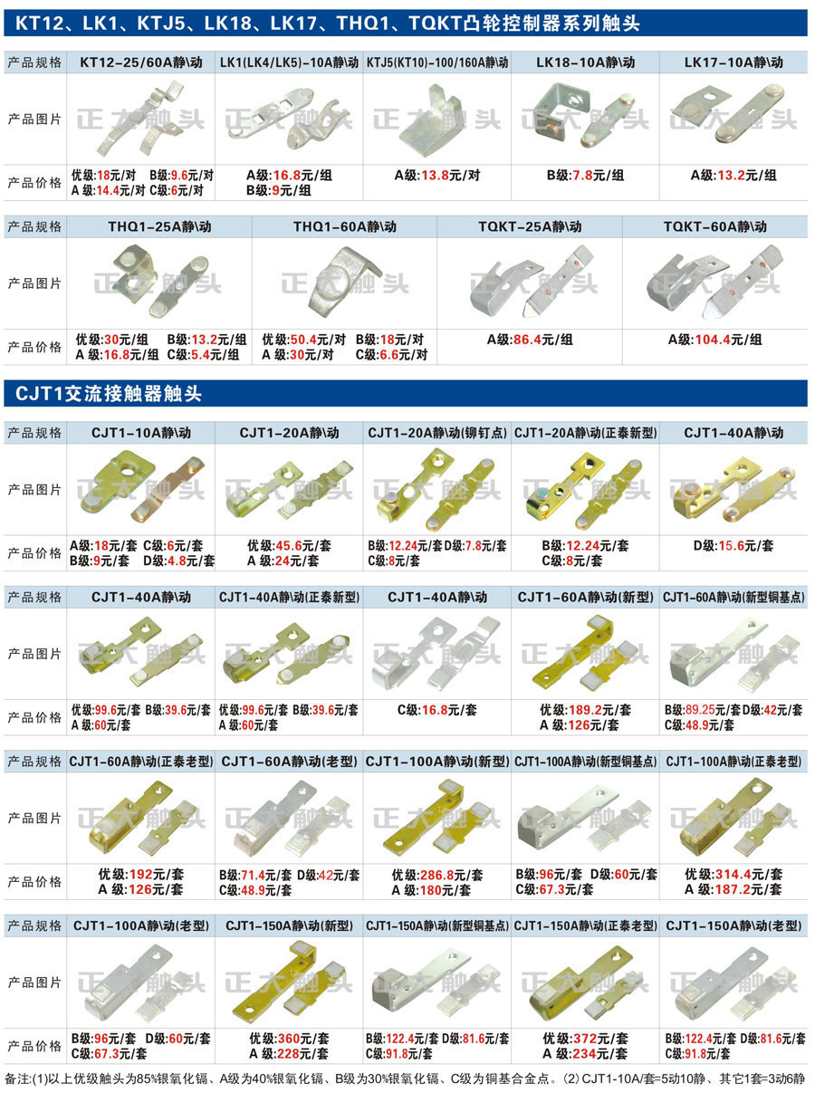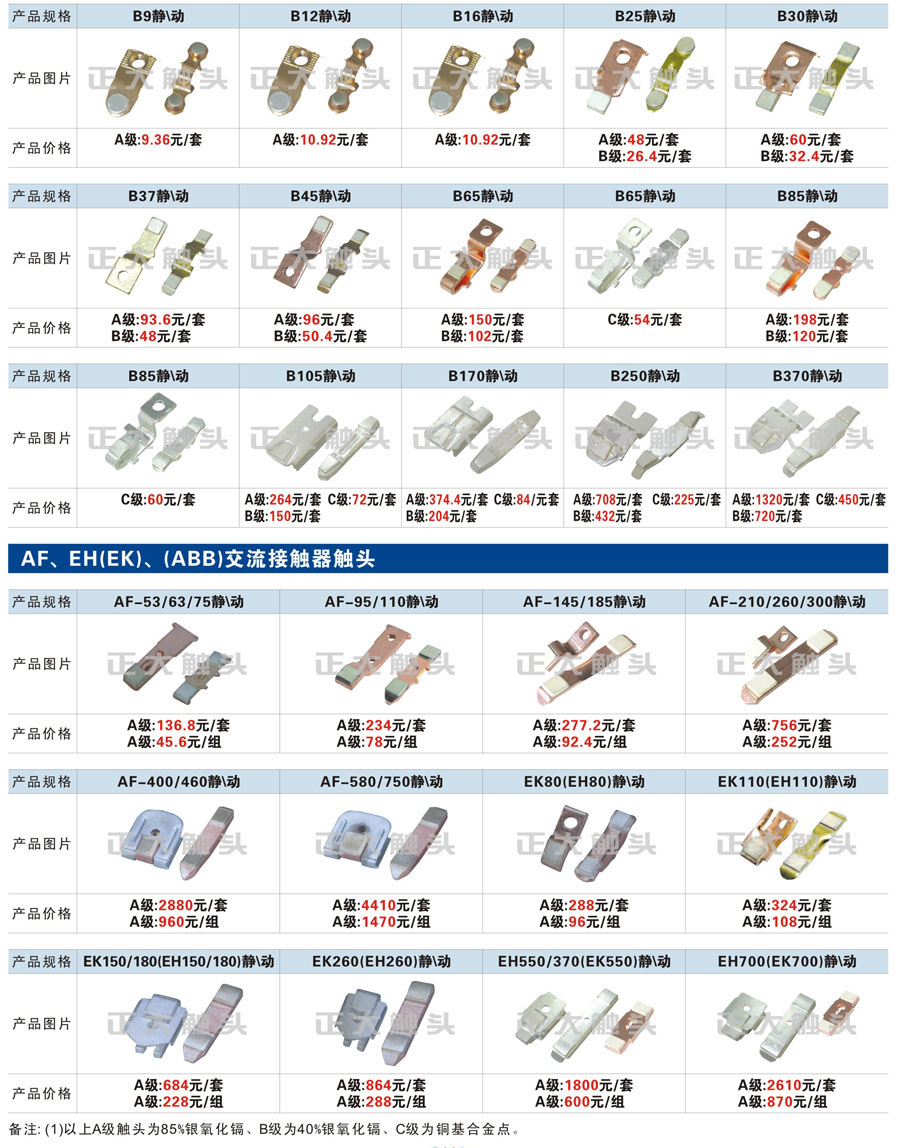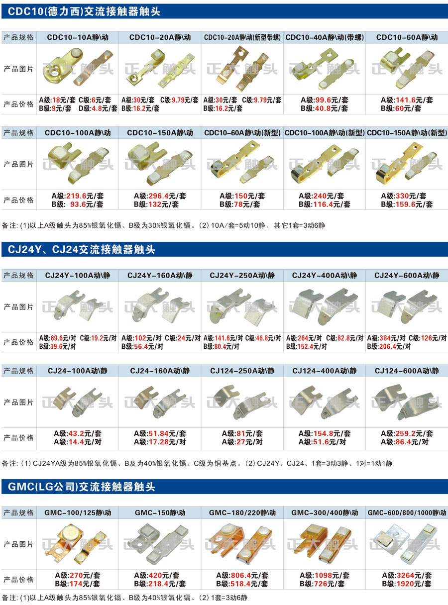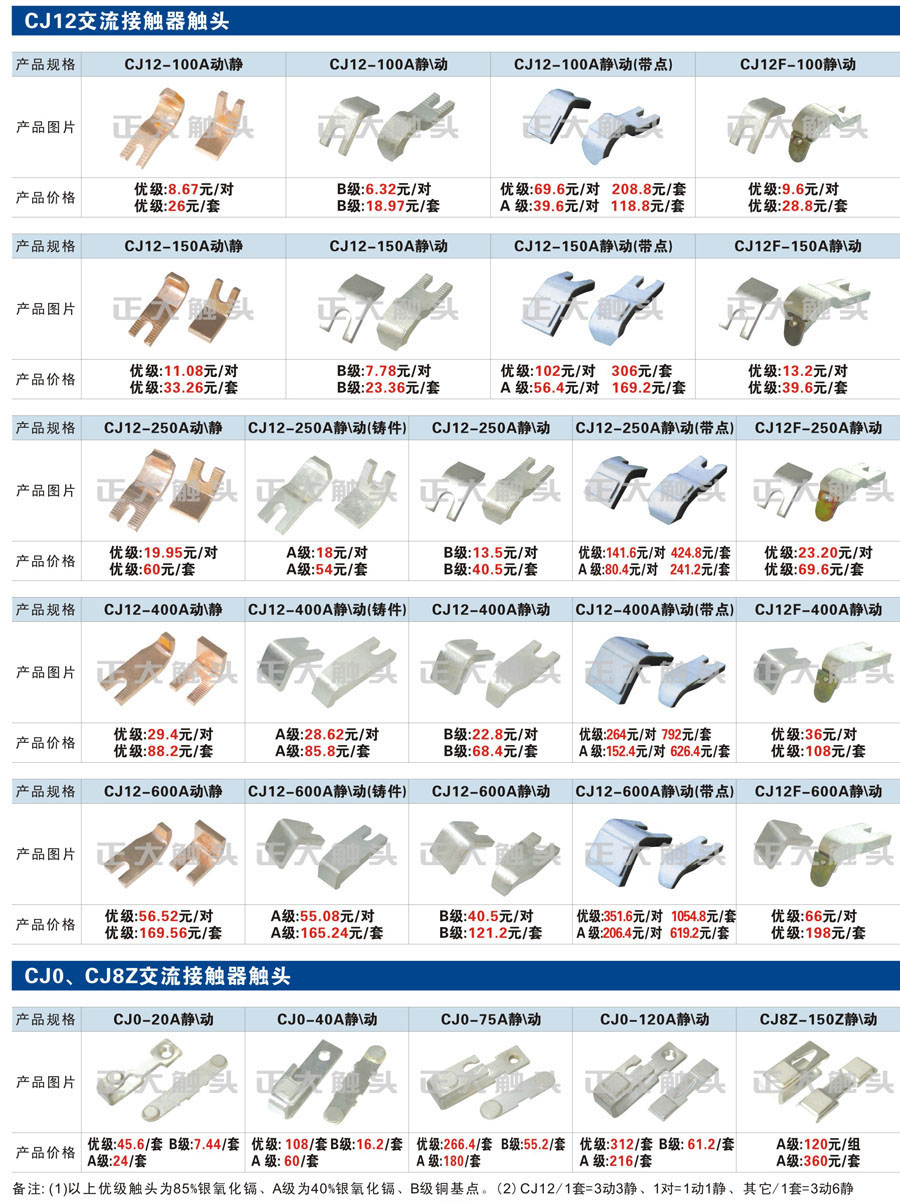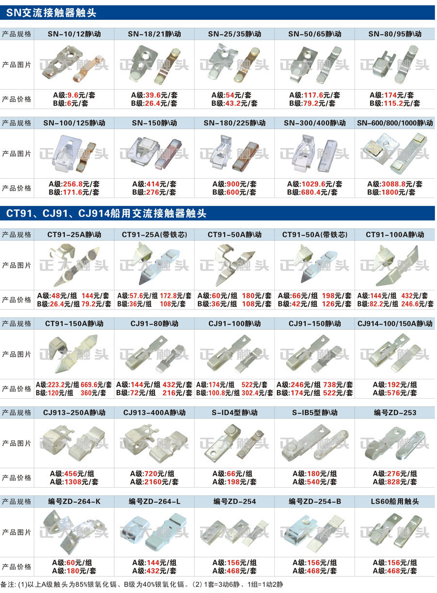 觸頭元件作為電器開關(guān)核心元件,主要用于接觸器,繼電器,斷路器,凸輪控制器,補償器,行程開關(guān),腳踏開關(guān),輔助開關(guān)等。正火電氣現(xiàn)生產(chǎn)CJT1,CJX1,CJX2,CJX4,CJX5,CJX8(B系列)CJ20,CJ40,CJ12,CJ15,CJ24,CJ24Y,CJ0,CDC10,CJ91,CT91,CJ913,CJ914,CJ3,CJ8Z交流接觸器觸頭,CZ0,CZ1,CZ3,CZ17,CZ18,CG5直流接觸器觸頭,QJ3,QC83補償器觸頭,凸輪控制器,主令觸頭,KT10,KT12,KT14,KTJ1,KTJ5,KTJ6,KTJ15(QT5),LK1,LK17,LK18,THQ1,TQKT等;斷路器觸頭DW10,DW16,DW15,DW17,DW45,DZ10,DZ20,內(nèi)燃機觸頭,礦用觸頭,叉車,吊車觸頭,JYN1,JYN2,ZN28,SN10,VS1,梅花觸頭等。進口ABB系列AF,EH,EK,富士SC系列,日立H系列,施耐德LC1系列,西門子3TF,3TB系列,LG公司(LS產(chǎn)電)GMC系列,三菱機電SN系列。與國內(nèi)正泰,德力西,天正,人民等,國外ABB,施耐德,西門子,富士,三菱等廠家電氣配套。