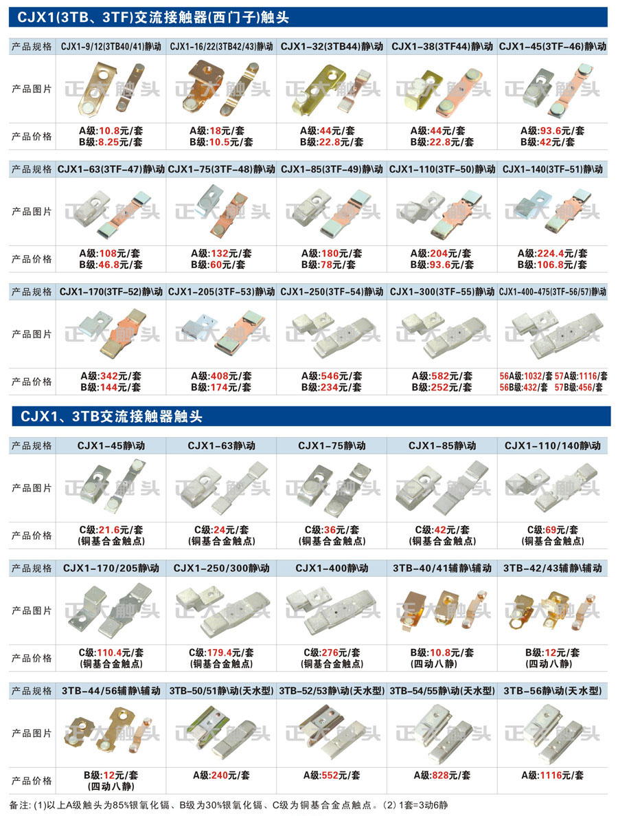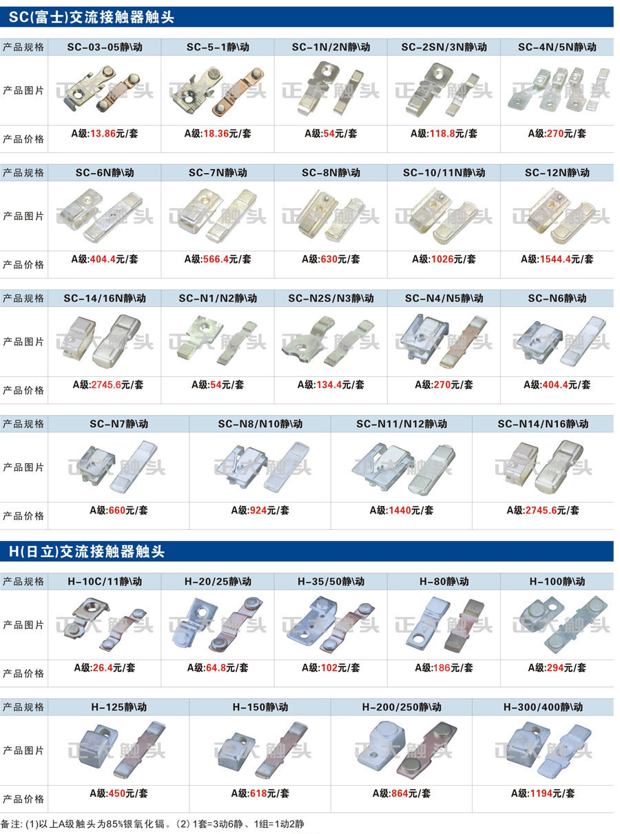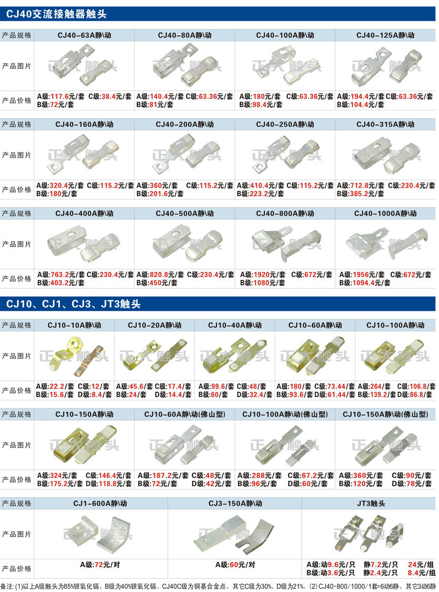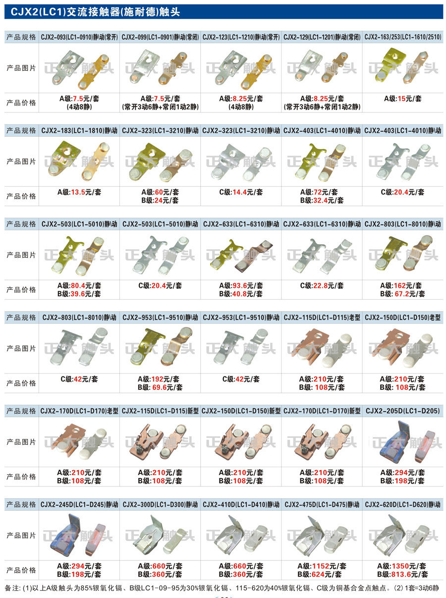 觸頭元件作為電器開關(guān)核心元件,主要用于接觸器,繼電器,斷路器,凸輪控制器,補償器,行程開關(guān),腳踏開關(guān),輔助開關(guān)等。正火電氣現(xiàn)生產(chǎn)CJT1,CJX1,CJX2,CJX4,CJX5,CJX8(B系列)CJ20,CJ40,CJ12,CJ15,CJ24,CJ24Y,CJ0,CDC10,CJ91,CT91,CJ913,CJ914,CJ3,CJ8Z交流接觸器觸頭,CZ0,CZ1,CZ3,CZ17,CZ18,CG5直流接觸器觸頭,QJ3,QC83補償器觸頭,凸輪控制器,主令觸頭,KT10,KT12,KT14,KTJ1,KTJ5,KTJ6,KTJ15(QT5),LK1,LK17,LK18,THQ1,TQKT等;斷路器觸頭DW10,DW16,DW15,DW17,DW45,DZ10,DZ20,內(nèi)燃機觸頭,礦用觸頭,叉車,吊車觸頭,JYN1,JYN2,ZN28,SN10,VS1,梅花觸頭等。進口ABB系列AF,EH,EK,富士SC系列,日立H系列,施耐德LC1系列,西門子3TF,3TB系列,LG公司(LS產(chǎn)電)GMC系列,三菱機電SN系列。與國內(nèi)正泰,德力西,天正,人民等,國外ABB,施耐德,西門子,富士,三菱等廠家電氣配套。