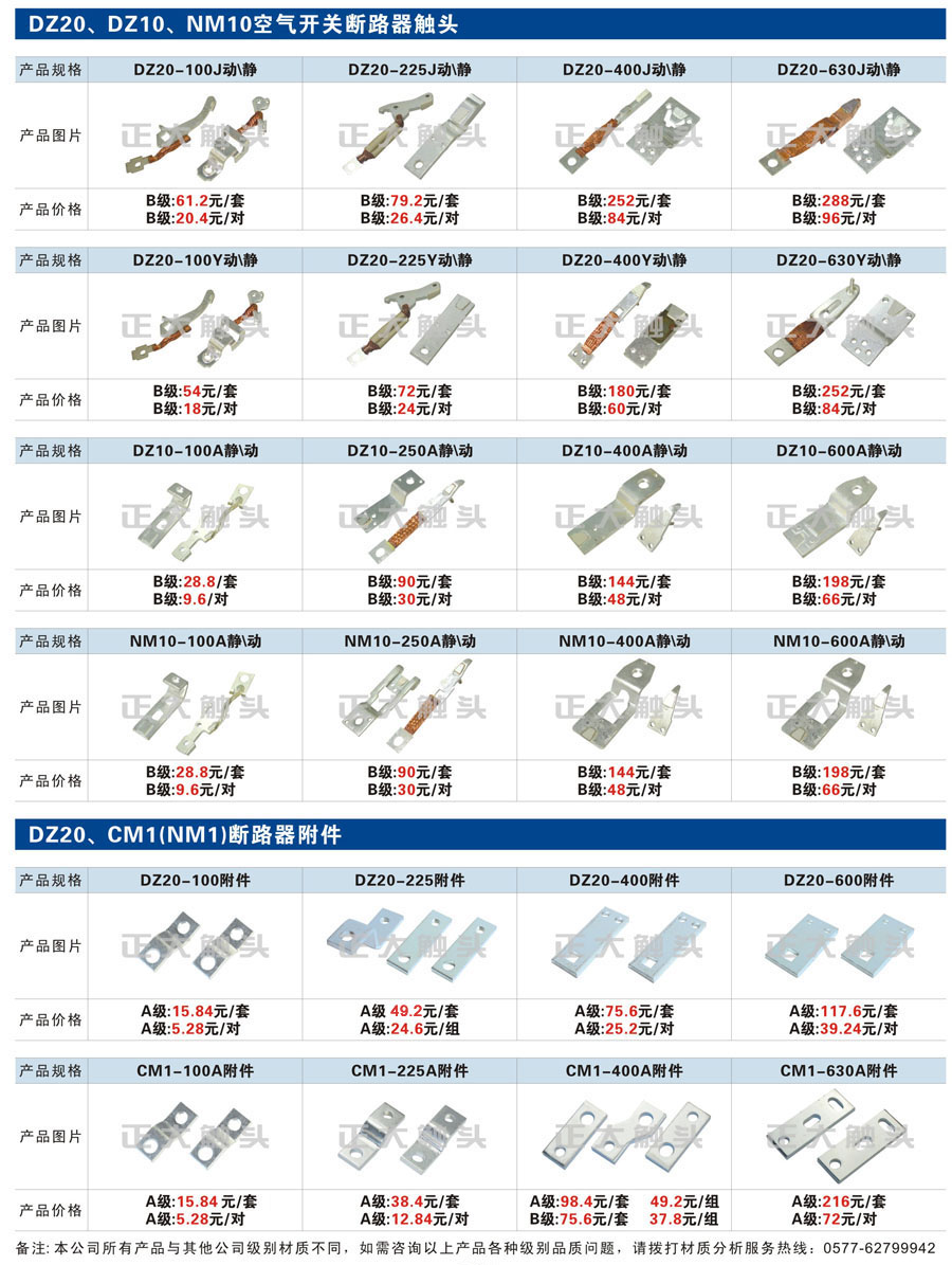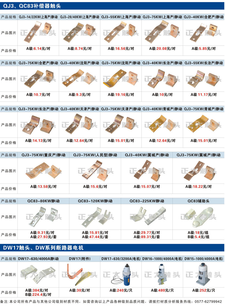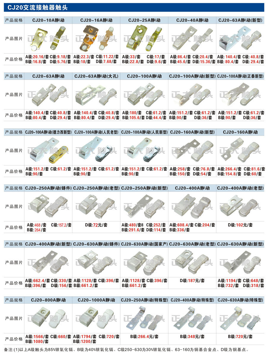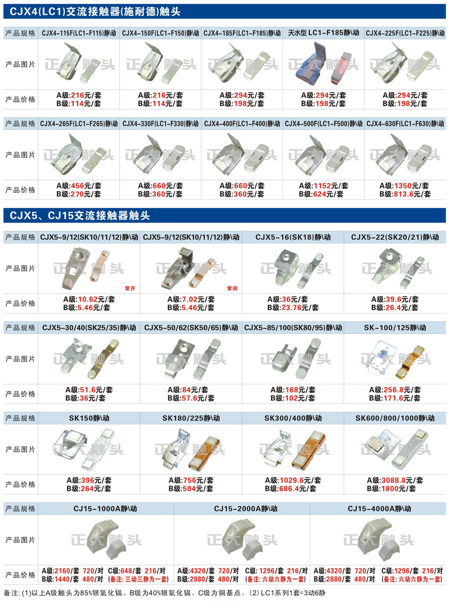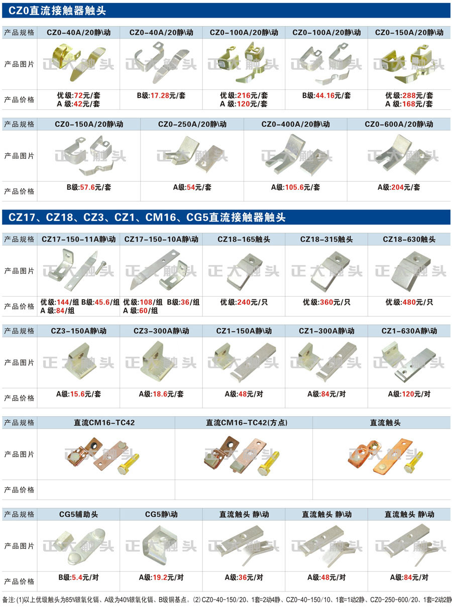 觸頭元件作為電器開關(guān)核心元件,主要用于接觸器,繼電器,斷路器,凸輪控制器,補償器,行程開關(guān),腳踏開關(guān),輔助開關(guān)等。正火電氣現(xiàn)生產(chǎn)CJT1,CJX1,CJX2,CJX4,CJX5,CJX8(B系列)CJ20,CJ40,CJ12,CJ15,CJ24,CJ24Y,CJ0,CDC10,CJ91,CT91,CJ913,CJ914,CJ3,CJ8Z交流接觸器觸頭,CZ0,CZ1,CZ3,CZ17,CZ18,CG5直流接觸器觸頭,QJ3,QC83補償器觸頭,凸輪控制器,主令觸頭,KT10,KT12,KT14,KTJ1,KTJ5,KTJ6,KTJ15(QT5),LK1,LK17,LK18,THQ1,TQKT等;斷路器觸頭DW10,DW16,DW15,DW17,DW45,DZ10,DZ20,內(nèi)燃機觸頭,礦用觸頭,叉車,吊車觸頭,JYN1,JYN2,ZN28,SN10,VS1,梅花觸頭等。進口ABB系列AF,EH,EK,富士SC系列,日立H系列,施耐德LC1系列,西門子3TF,3TB系列,LG公司(LS產(chǎn)電)GMC系列,三菱機電SN系列。與國內(nèi)正泰,德力西,天正,人民等,國外ABB,施耐德,西門子,富士,三菱等廠家電氣配套。
