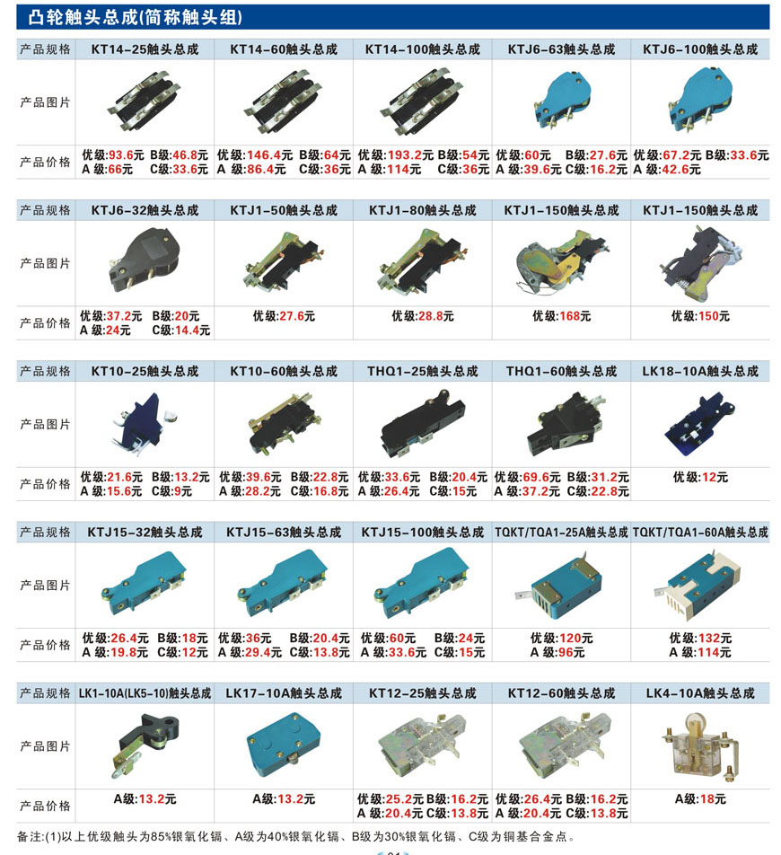 根據(jù)觸頭觸點的含銀量氧化鎘分別為:88%,85%,40%,30%,電壓正常情況下,環(huán)境污染較輕時,含88%,85%,銀氧化鎘觸頭電壽命達10萬次以上,含40%、30%銀氧化鎘觸頭電壽命可達5萬次以上,混合銀點,銅基點觸頭適用于分合次數(shù)較少的接觸器